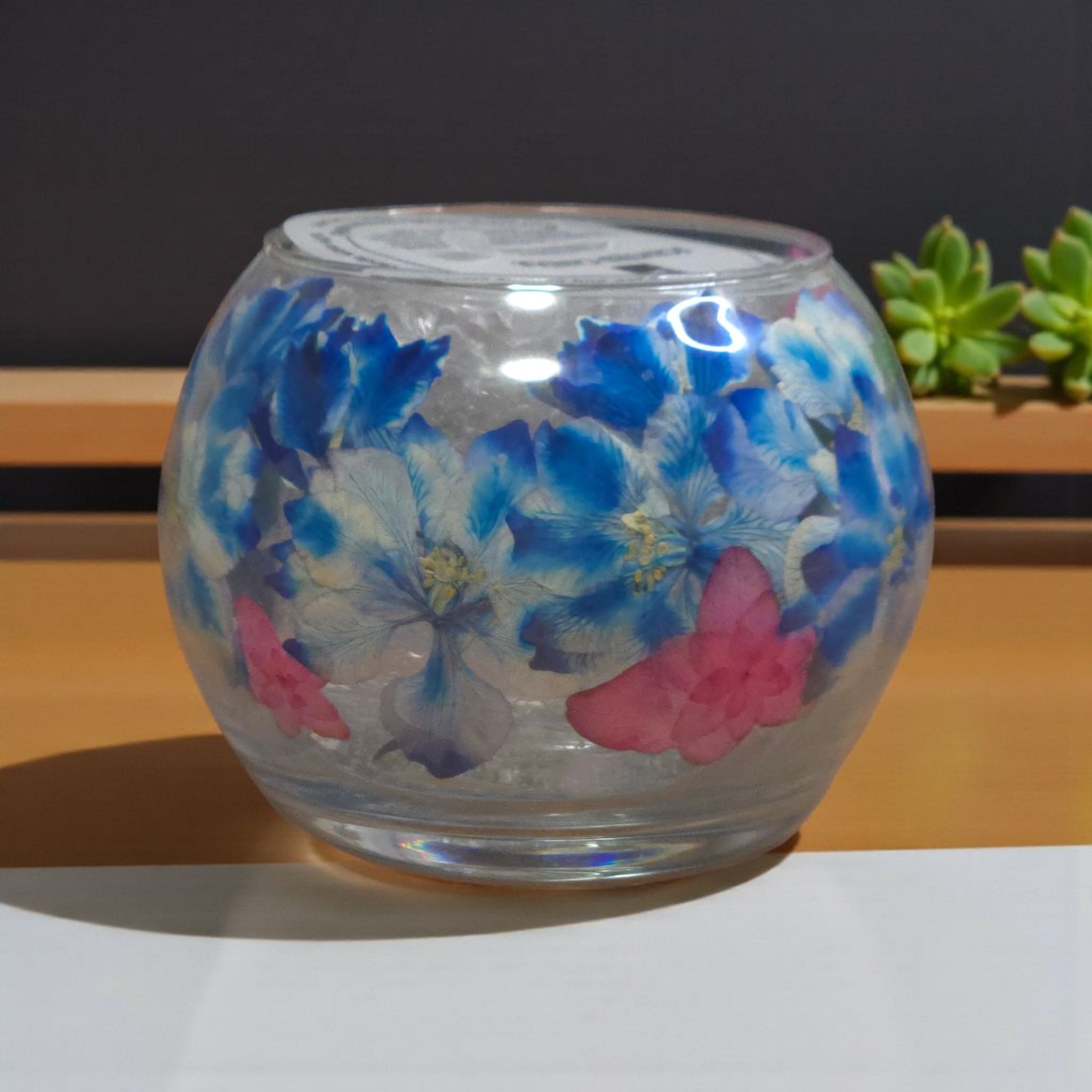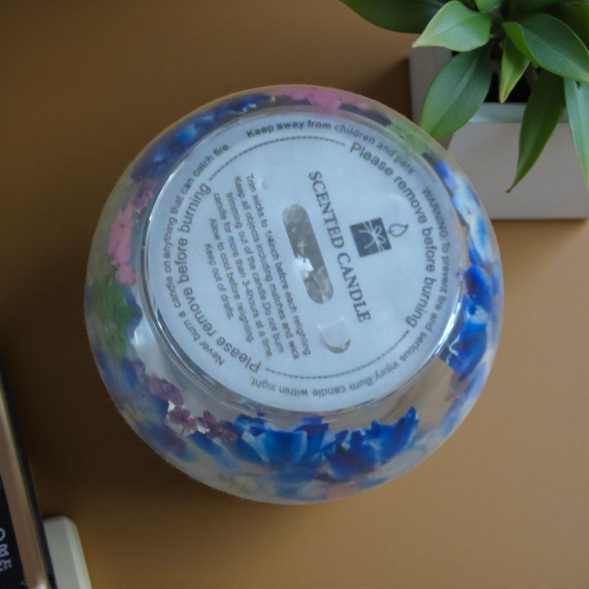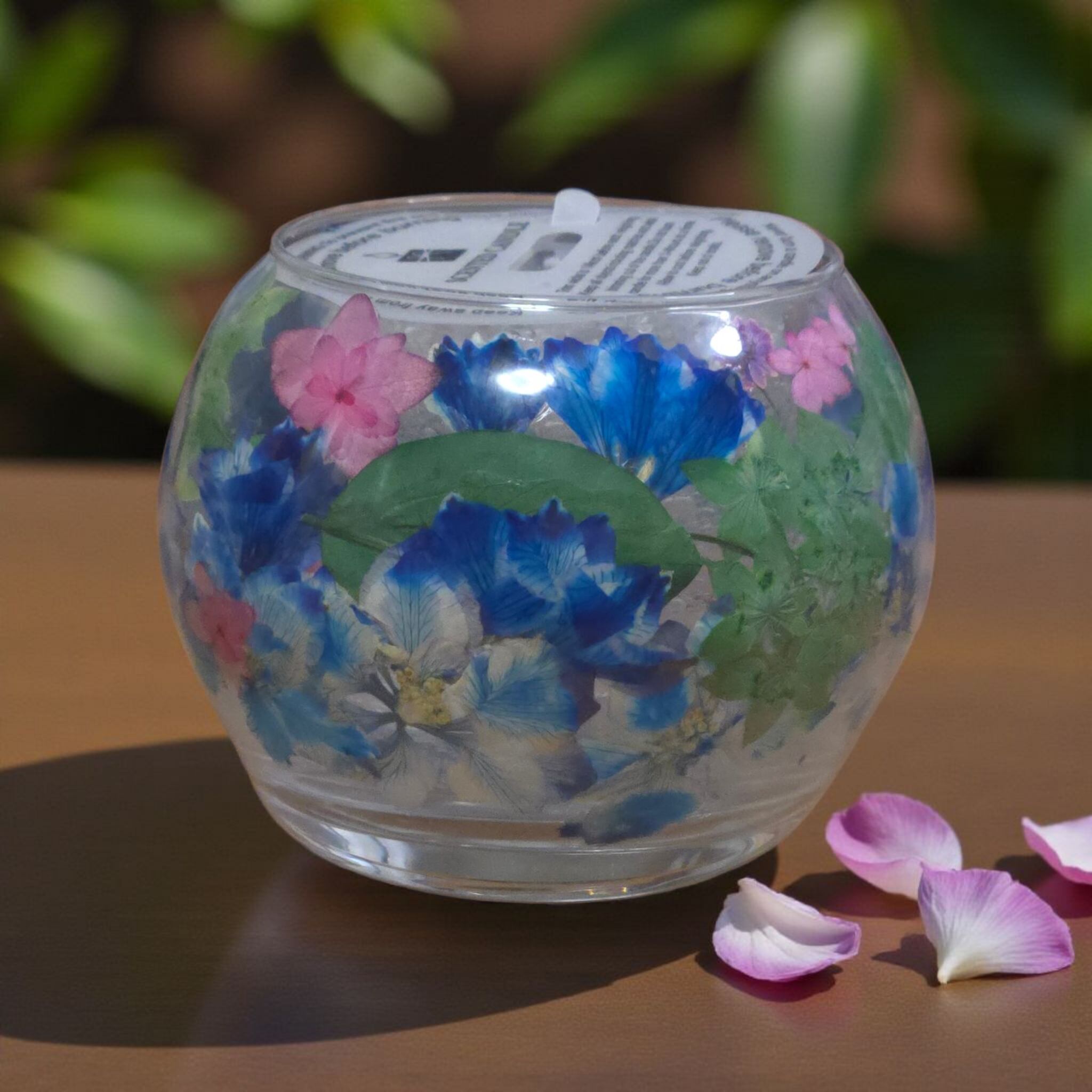 このキャンドルは、青色を基調とした美しい押し花が優雅に閉じ込められている点が特徴です。穏やかな光が灯ることで、日常の疲れを癒し、リラックスしたひとときを演出します。読書やくつろぎの時間にぴったりなアイテムで、手作りの温もりが感じられ、どんなインテリアにも美しく調和します。