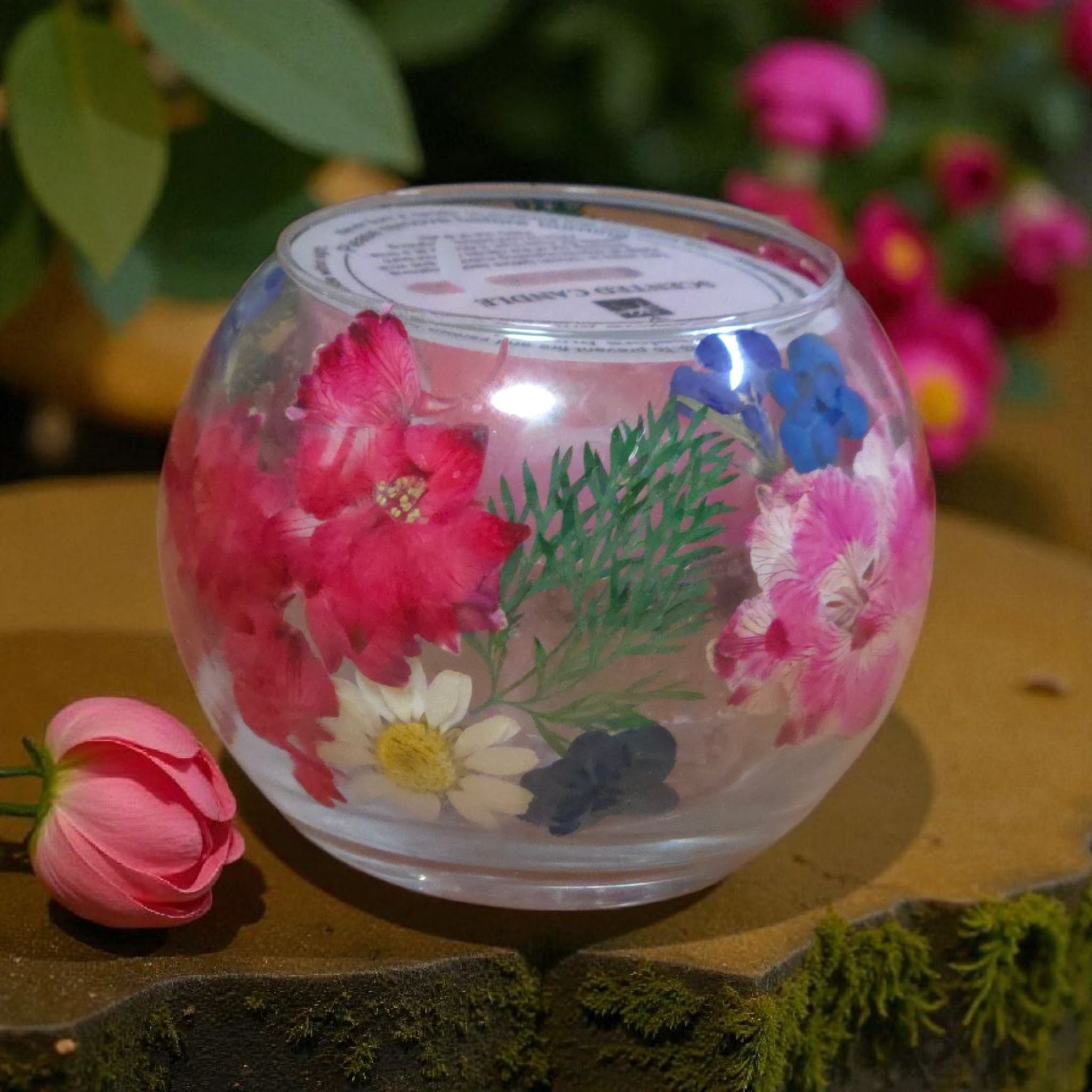 このキャンドルの最大の特徴は、透明感のあるジェルに華やかな押し花が丁寧に閉じ込められていることです。ローズの精油を使用し、心地よい香りが広がり、リラックスした空間を演出します。バスタイムや瞑想のひとときにぴったりのアイテムです。手作りならではの温もりを感じるデザインは、どんなインテリアにも自然に溶け込むことでしょう。