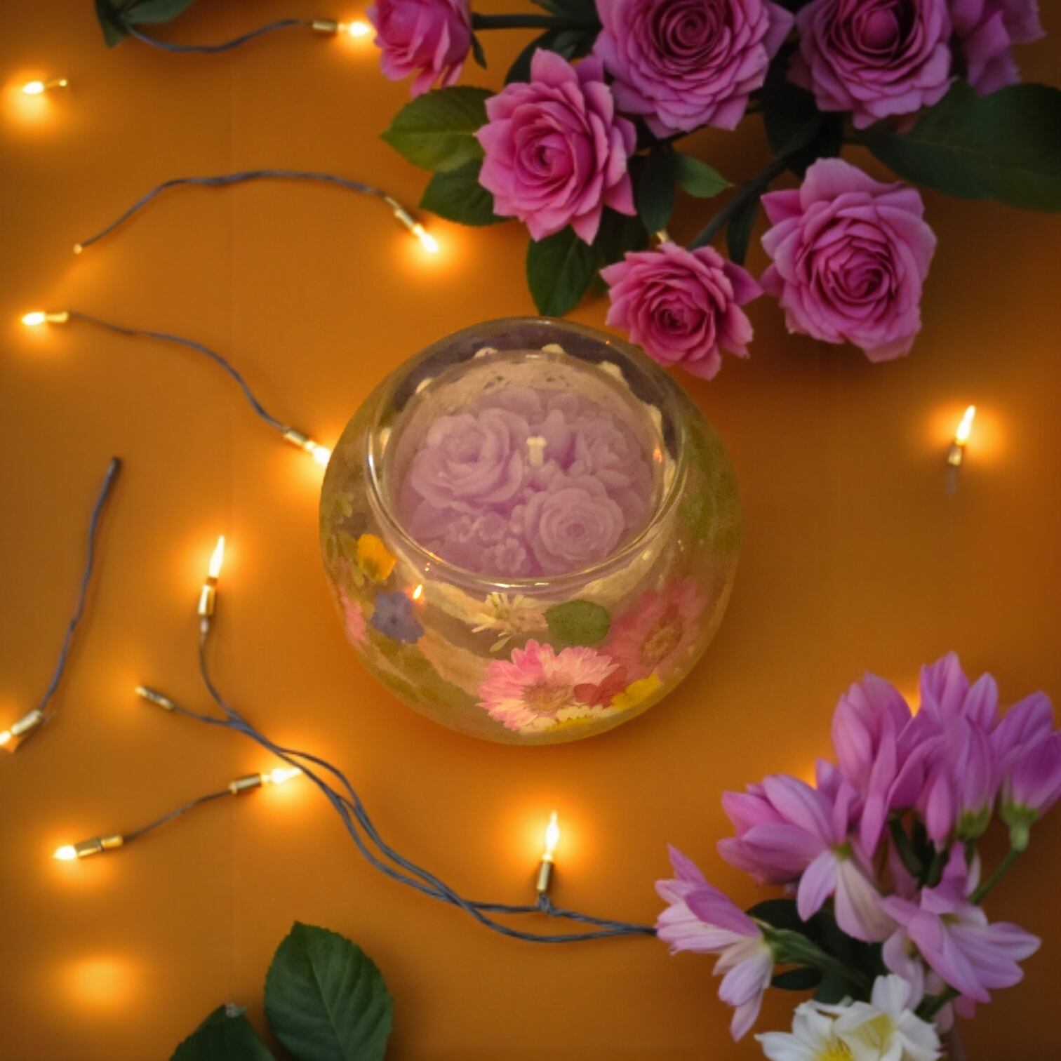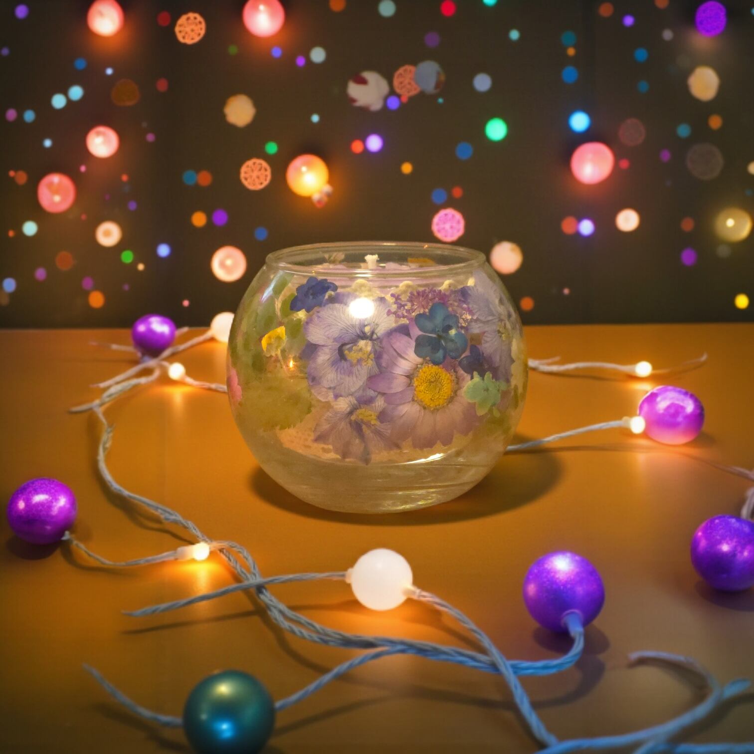 特別な日や日常に、彩りと癒やしを添えるアロマキャンドルです。二重になったガラスのバブルボールの中に、繊細な押し花を閉じ込め、上部には華やかなキャンドルカービングを施しました。火を灯せば、ラベンダーの優しい香りが空間を満たします。