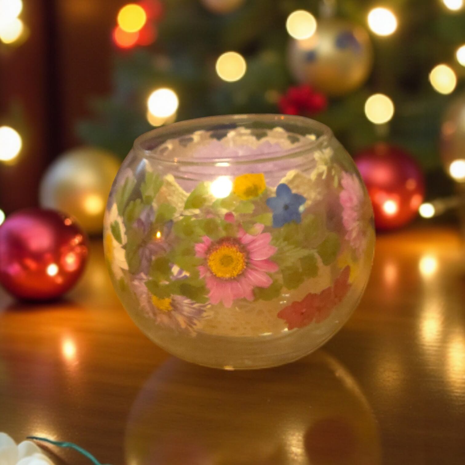 ガラスの外側に、色鮮やかな本物の押し花を丁寧に配置しました。一点一点異なる花の配置は、まさに世界に一つだけのデザインです。