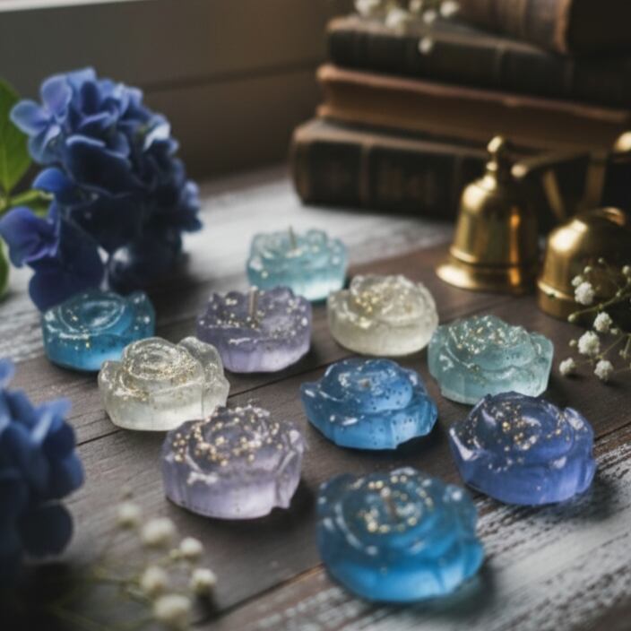 中には手作りのバラのパーツが贅沢に閉じ込められており、火を灯すと幻想的な陰影を作り出します。