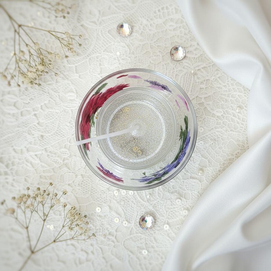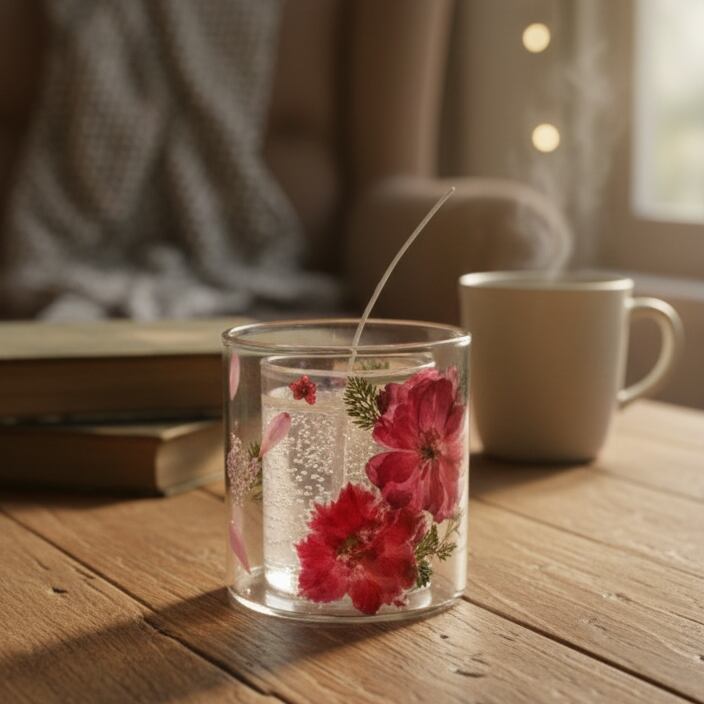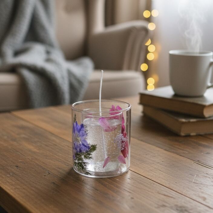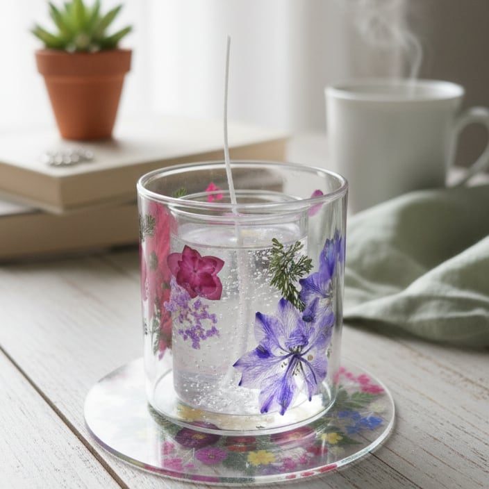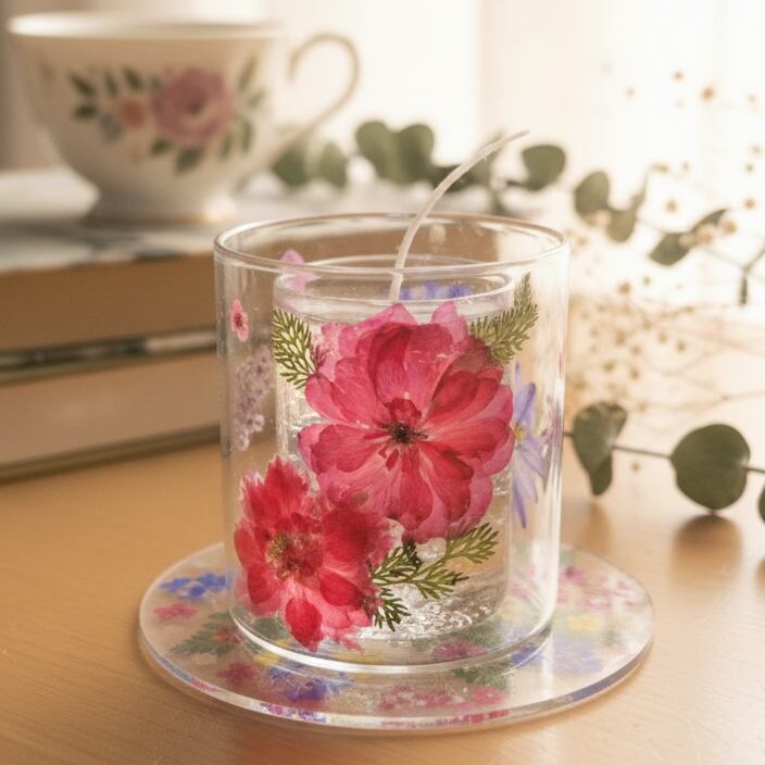 【コースター付】ボタニカルジェルキャンドル | サンダルウッドの香り | 押し花と気泡の輝き