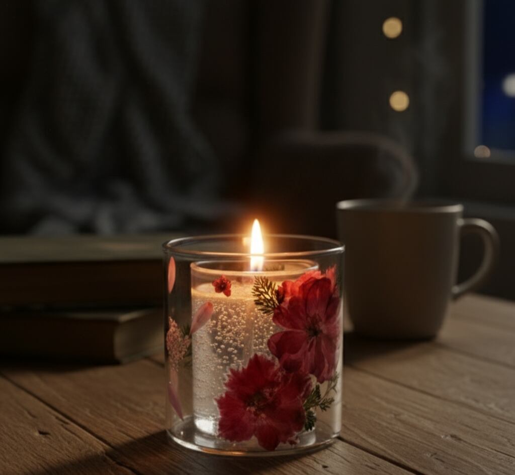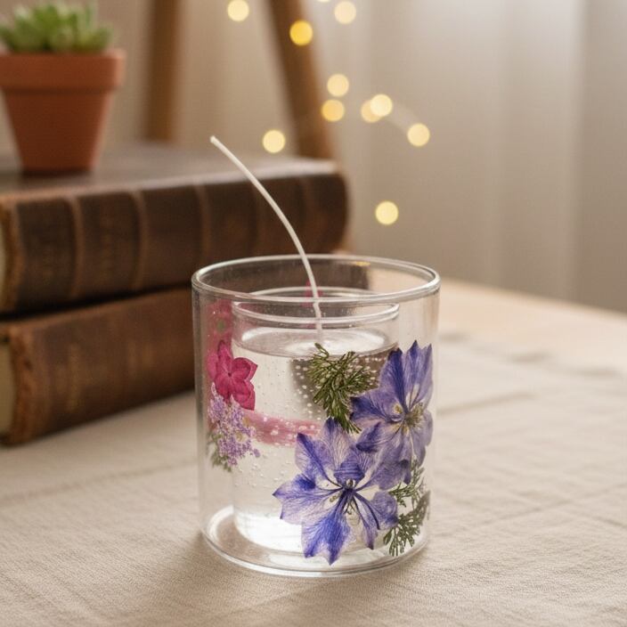 透明度の高いジェルワックスの中に、色鮮やかな押し花を閉じ込めたボタニカルキャンドルです。